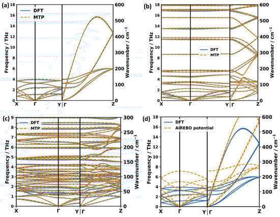 For benchmarking phonons over the entire frequency range, plotting band structures is not ideal, as the resulting plots would become far too busy. Thus, Figures S11–S13 in the Supplementary Materials compare the phonon densities of states for the “best” versions of MTPphonon. Again, the agreement is extraordinary. To illustrate that the excellent agreement between the phonon band structures calculated with DFT and classical force fields cannot be taken for granted, Figure 7d compares the DFT-generated bands with those obtained using a traditional, transferrable force field for PE. Here, we choose the AIREBO potential [71], which has been commonly used for PE, even as recently as 2020 [8,15,72]. While the AIREBO potential does reproduce the overall shape of the phonon band structure of PE, it severely (in some instances, even by a factor of two) overestimates the frequencies of all phonons. This also results in significantly too large group velocities, which makes this force field unsuitable for calculating, for example, thermal conductivities, which will be the topic of Section 2.6.
