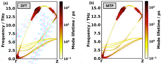 Figure 8 compares the DFT- and MTPphonon-calculated phonon band structures of PE with the sizes of symbols scaled linearly and their coloring logarithmically with the respective phonon lifetimes. Again, the agreement between the two methods is excellent. Interestingly, for both methodologies, one observes an unusual behavior, as phonon lifetimes do not decrease steadily with frequency (as observed usually), but become particularly large for longitudinal acoustic phonons between 12 THz and 15 THz. Following the arguments of Wang et al. [73], who observed this unusual behavior for a single PE chain, it can be explained in the following way: longitudinal acoustic (LA) phonon modes between 5.5 THz and 11 THz have only a low contribution to the thermal conductivity, as the corresponding phonon lifetimes are small. This is the consequence of efficient Umklapp scattering processes involving twisting and transverse modes, e.g., LA → TWA + TA1 (LA = longitudinal acoustic, TWA = twisting acoustic, TA1 = transverse acoustic) [73]. Energy conservation, however, forbids scattering processes of the form LA → TWA + TA1 for phonons with frequencies above ~12 THz, as then, the LA phonons have more than twice the maximum energy of the TA and TWA modes. As a consequence, when only considering three-phonon processes a steep increase in phonon lifetime between 12 THz and 15 THz is obtained. The phonons of a single PE chain deviate in some respects from that of the PE crystal studied here. For example, there are no optical modes below 20 THz [73]. Moreover, for a single PE chain, the twisting mode has zero frequency at the Γ-point, and is, thus, an acoustic mode, whereas, in a PE crystal, the twisting mode has a nonzero frequency at the Γ-point and is, thus, an optical mode. Despite these differences between the single PE chain and the PE crystal, the core argument of Wang et al. concerning energy conservation can also be applied in the case of PE crystals.
