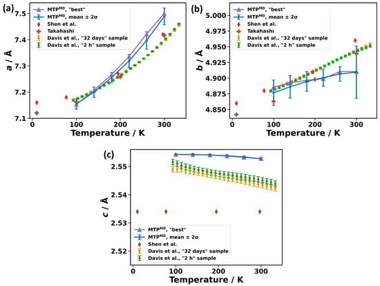 Importantly, DFT and MTP relaxations not only yield equivalent lattice constants, but also yield the same symmetries for all materials. PE and PT have an orthogonal unit cell (all angles, including α, are 90°). P3HT has a monoclinic symmetry with α, the angle between the b and c lattice vector, being slightly below 90°. When comparing the MTP-simulated unit cell parameters to experiments, the overall agreement is still convincing. For most values, the deviations are, however, clearly larger than the deviations from the DFT structures. This is due to three reasons: (i) there is a non-negligible experimental error manifested in the deviations between different experiments that are sometimes even larger than the deviations in individual experiments from the DFT results, (ii) several of the experiments are performed at elevated temperatures, while, for the simulated values reported in Table 1, thermal expansion is not considered (compare Section 2.7), and (iii) even though PBE + D3 used in the DFT simulations is known to provide a very good description of the structures of molecular crystals, it is certainly not perfect [56,57], and one cannot expect a machine-learned potential to perform better than the ab initio methodology used for its parametrization. Overall, the MTPs are still capable of excellently reproducing the densities of the crystalline polymers.