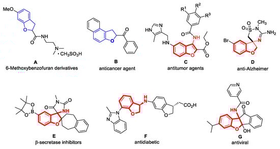 The 3-aminobenzofuran scaffold represents a significant subclass within the diverse family of benzofuran-based compounds, occupying a prominent position at the forefront of medical treatment advancements and innovations [12,13,14]. Its unique structural features contribute to its promising potential in developing novel therapeutic agents [15,16,17] (Figure 1). Compound C exhibits potent antitumor properties by inducing cell cycle arrest and promoting apoptosis within cellular environments [18]. Compound D stands as a crucial constituent in therapeutic agents aimed at alleviating the symptoms of Alzheimer’s disease [19].