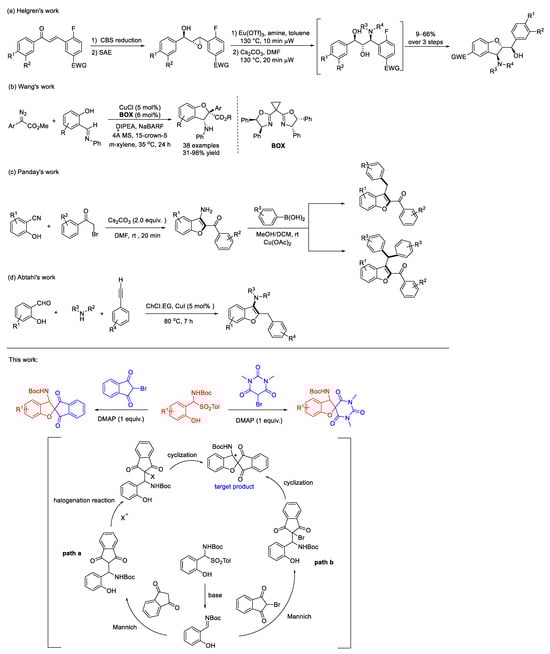 Meanwhile, indanone and barbituric acid are prevalent in natural products and bioactive pharmaceutical molecules [29,30,31,32,33]. The structures of 1,3-indanedione and 1,3-dimethylbarbituric acid, which serve as pivotal pharmacophore scaffolds, have garnered extensive research attention. The conventional utilization of 1,3-indandione [34] and 1,3-dimethylbarbituric acid [35,36] structures has been primarily focused on their benzylidene unsaturation moiety, offering a rich platform for chemical modifications and diverse functionalization. However, there is a scarcity of reports detailing their involvement in tandem cyclization reactions, highlighting an underexplored area with significant potential for further investigation and development [37,38,39,40]. The combined pharmacophore strategy allows us to harness the potential of 1,3-indandione and 1,3-dimethylbarbituric acid to engage in tandem reactions with ortho-hydroxy α-amino sulfones, thereby constructing a series of target products featuring an aminobenzofuranospiroindanone and spirobarbiturate core skeleton. While devising a synthetic route, several unsuccessful attempts were made to utilize halogen-substituted N-succinimides as the primary halogen source (Scheme 1, path a). We then strategically shifted our focus to bromine-substituted 1,3-indandione as the substrate (Scheme 1, path b), a pivotal decision that ultimately led to the synthesis of a product structure with profound implications for the development of novel therapeutic agents.