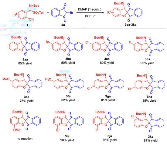 - ortho-Hydroxy α-aminosulfone 1 (0.15 mmol), 2-bromo-1,3-indandione 2a (0.1 mmol), and 4-dimethylaminopyridine (DMAP) (1.0 equiv.) were combined in dry DCE (1.0 mL) in a 5 mL glass reaction vessel. The reaction system was stirred at room temperature for 20 h. After the completion of the reaction, which was monitored by thin-layer chromatography, the crude product was separated by means of a silica gel rapid column chromatography (ethyl acetate/petroleum ether 1:5) to obtain 3.