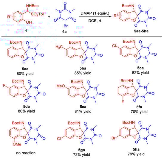 A mixture comprising ortho-hydroxy α-aminosulfone 1 (0.15 mmol), 5-bromo-1,3-dimethylpyrimidine-2,4,6(1H,3H,5H)-trione 4a (0.1 mmol), and 4-dimethlaminopyridine (DMAP) (1.0 equiv.) was assembled in anhydrous dichloroethane (DCE, 1.0 mL) within a 10 mL glass reaction vessel. This reaction ensemble was agitated at ambient temperature for 10 h. Upon completion of the reaction, monitored via thin-layer chromatography (TLC), the crude product mixture underwent purification via silica gel flash column chromatography, employing a solvent system of ethyl acetate and petroleum ether in a ratio of 1:5, affording the desired product 5.