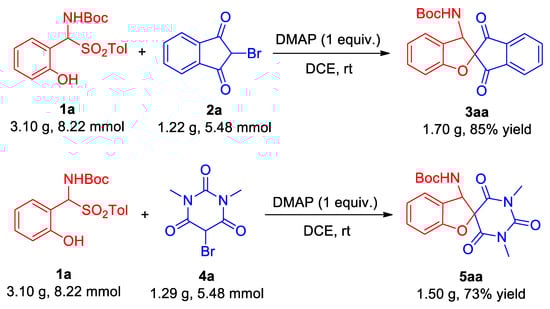 To demonstrate the practicality and stability of the DMAP-catalyzed tandem cyclization reaction involving ortho-hydroxy α-aminosulfone, an endeavor has also been made to conduct the reaction on a Gram-scale basis. As depicted in Scheme 4, the initial reaction scale was enlarged by approximately 55-fold. For the Gram-scale synthesis of ortho-hydroxy α-aminosulfone 1a with 2-bromo-1,3-indandione 2a, the target product 3aa was ultimately achieved with the same high yield (85%) as in previous smaller-scale reactions. Nevertheless, in the Gram-scale reaction involving ortho-hydroxy α-aminosulfone 1a and 5-bromo-1,3-dimethylbarbituric acid 4a, the yield decreased slightly but remained moderate (73%), enabling the successful isolation of the target product 5aa. This underscores the considerable potential of this methodology for the large-scale production of such compounds via tandem cyclization reactions.