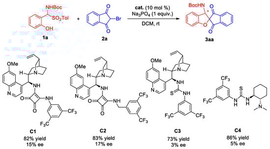 Drawing upon our previous investigations into asymmetric catalysis [41,42,43], we have embarked on an extended exploration of this particular reaction, aiming for a more profound understanding. Consequently, catalysts C1–C4 with varying structural types were selected for application in this asymmetric catalytic reaction (Scheme 6). Firstly, the reactions of cinchona alkaloid-derived squaramide catalysts (C1 and C2) catalyzed addition/cyclization of ortho-hydroxy-α-aminosulfone 1a with 2-bromo-1,3-indandione 2a showed relatively good catalytic performance, with catalyst C2 exhibiting the best performance. The catalytic product 3aa was obtained in 85% yield with 17% ee. When cinchona alkaloid and 1,2-diaminocyclohexane-derived thiourea catalysts (C3 and C4) were employed, the catalytic effect of the reactions was found to be even worse. Furthermore, catalyst C1 was used to catalyze the asymmetric tandem cyclization reaction of ortho-hydroxy α-aminosulfone 1a and 5-bromo-1,3-dimethylbarbituric acid 4a, yet the enantiomeric excess of the product was only 22% ee. Through analysis of the results, it can be seen that the multifunctional hydrogen bond-derived thiourea and squaramide catalysts exhibit generally poor asymmetric catalytic performance for this type of reaction.