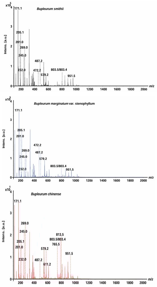 B. smithii (BS), B. marginatum var. stenophyllum (BM), and BC were analyzed by MALDI-MS (Figure 1). The mass spectra of saikosaponins, saikosaponin synthesis pathway compounds, and non-saikosaponin components exhibit distinct characteristics across the three species of Bupleurum, offering compelling evidence for their identification and differentiation. The saikosaponins, non-saikosaponins, and saikosaponin synthesis pathway compounds of the three Bupleurum roots were tentatively determined based on their molecular weight measurements, MS/MS fragmentation patterns, and characteristic fragment ions. There were 12, 12, and 14 peaks for BS, BM, and BC, respectively. These were identified as saikosaponins, non-saikosaponins, and saikosaponin synthesis pathway compounds (Table 1). The detected ions were prominently in the potassium, sodium, and hydrogen adduct forms of saikosaponins, non-saikosaponins, and saikosaponin synthesis pathway compounds. Some common peaks were identified as saikosaponin A (m/z 951.5), saikosaponin B3 (m/z 813.5), saikosaponin C (m/z 765.5), saikosaponin E/F (m/z 803.4), saikosaponin F/E (m/z 803.5), non-saikosaponin (m/z 611.2, m/z 579.2, m/z 487.2, m/z 245.0, and m/z 205.1), and saikosaponin synthesis pathway compounds (m/z 472.2, m/z 269.0, m/z 232.0, m/z 201.0, and m/z 171.1).