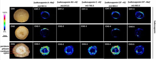 Bupleurum is a genus of the Apiaceae, comprising about 200 species. In China, about 44 species, 17 varieties, and 7 forma have been identified and are distributed widely across the country in 27 provinces [1,2]. Chaihu (Bupleuri Radix), the dried roots of Bupleurum chinense DC. and B. scorzonerifolium willd., is a famous Traditional Chinese medicinal herb with a history of medical use for more than 2000 years. Its main bioactive metabolites are saikosaponins and flavonoids. Saikosaponins and flavonoids are the main effective components of Bupleurum, and they can help treat diseases [3]. To measure the quality of Bupleurum, HPLC and GC-MS can be used to identify saikosaponins and flavonoids in Bupleurum [4,5]. This traditional method for the identification of the quality of Bupleurum could not be used to detect the spatial distribution of saikosaponins or other components in Bupleurum.