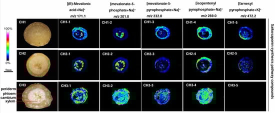 The content of saikosaponin synthesis pathway compounds in BC was abundantly distributed in the periderm, phloem, and xylem of roots (Figure 5). Four compounds-(R)-mevalonic acid, mevalonate-5-phosphate, mevalonate-5-diphosphate and isopentenyl pyrophosphate-were detected in BC, but farnesyl pyrophosphate was not observed. The five compounds were detected in BS and BM, but the content was significantly lower than in BC.