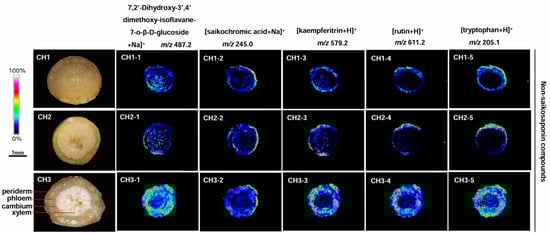 Five non-saikosaponin compounds were detected, including 7,2′-dihydroxy-3′,4′-dimethoxy-isoflavane-7-o-β-D-glucoside, saikochromic acid, kaempferitrin, rutin, and tryptophan in BS, BM, and BC, but the content differed (Figure 6). The most abundant non-saikosaponin was observed in all parts of BC roots, while the content of BM and BS was significantly reduced and only seen in the cortex near the periderm. There was almost none in the phloem and xylem.