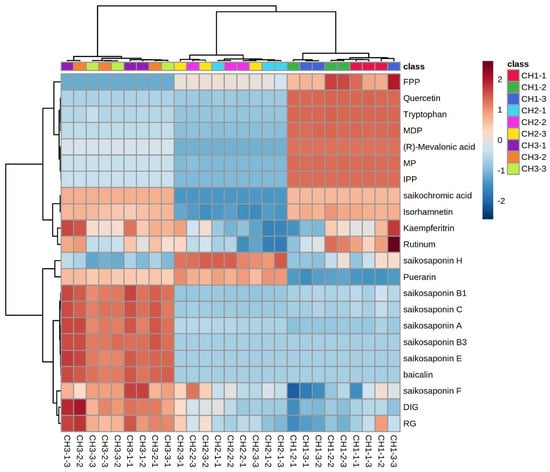 Cluster heatmap of chemical constituents of the three Bupleurum species. FPP: farnesyl pyrophosphate; MDP: mevalonate-5-diphosphate; MP: mevalonate-5-phosphate; IPP: isopentenyl pyrophosphate; RG: isorhamnetin-3-O-glucoside; and DIG: 7,2′-dihydroxy-3′,4′-dimethoxy-isoflavane-7-o-β-D-glucoside. CH1: BS; CH2: BM; CH3: BC.