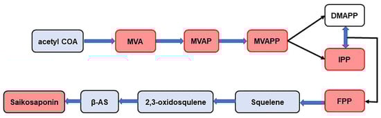 Synthetic pathway of saikosaponin (the compounds in the red box are the compounds identified in this experiment). MVA: mevalonic acid, MVAP: mevalonate-5-phosphate, MVAPP: mevalonate-5-pyrophosphate, DMAPP: dimethylallyl diphosphate, IPP: isopentenyl diphosphate, FPP: farnesyl pyrophosphate, β-AS: β-amyrin.