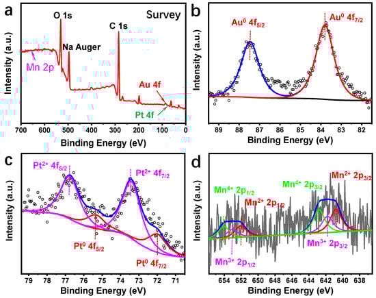 XPS analysis was conducted on the Au10Pt1@MnO2-M composite material to investigate the chemical valence states of each element, as shown in Figure 2. The XPS spectra revealed characteristic peaks of Au, Pt, and Mn elements in the samples. There are peaks of O 1s, C 1s, and Na Auger in the XPS pattern (Figure 2a), in which Na may be derived from the residual ions after the reaction of sodium citrate and then adsorbed on the MnO2 nanosheets. Peaks at binding energies of 83.8 eV and 87.45 eV, corresponding to Au0 4f7/2 and Au0 4f5/2, respectively [36], indicate the presence of Au in a zero valence state. Similarly, peaks at 72.05 eV and 75.45 eV are attributed to Pt0 4f7/2 and Pt0 4f5/2, while peaks at 73.45 eV and 76.8 eV correspond to Pt2+ 4f7/2 and Pt2+ 4f5/2, respectively [37]. In the previous work [35], the Pt element in the structure of Au10Pt1 HSNRs is mainly in a zero-valence state, while in the Au10Pt1@MnO2-M composite, the larger peak area of Pt2+ (73.9%, as shown in Table S1) suggests that Pt2+ is the predominant form, likely due to the oxidation by KMnO4 during the preparation of the material. For Mn 2p, three valence states were observed: Mn2+ 2p3/2 and Mn2+ 2p1/2 at 640.8 eV and 652.05 eV, Mn3+ 2p3/2 and Mn3+ 2p1/2 at 641.8 eV and 653.05 eV, and Mn4+ 2p3/2 and Mn4+ 2p1/2 at 642.8 eV and 654.05 eV [36]. The largest peak area corresponding to Mn4+ (37.6%, as Table S1 shown) suggests that the Mn elements primarily exist in the form of MnO2, with a portion of the KMnO4 precursors being reduced to the lower valence states of Mn3+ and Mn2+ [38]. The presence of the lower oxidation Mn states (Mn3+ and Mn2+), as described by Wei et al., may result in the creation of cationic vacancies, which can serve as anchor points for nanoparticles [39].