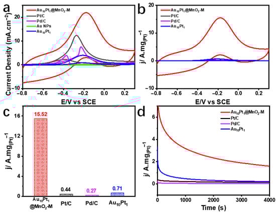 The Au10Pt1@MnO2 composite structure was evaluated for its performance in methanol electrooxidation. As shown in Figure 5a, the cyclic voltammetry (CV) curves of different electrocatalysts in a mixed electrolyte of 1 M KOH and 1 M CH3OH at a scan rate of 10 mV/s were compared. The Au10Pt1@MnO2-M composite structure showed the best catalytic activity, achieving an onset potential of 0.31 V vs RHE and a peak current density of 21.95 mA/cm2. In Figure 5b, CV curves normalized by the mass of Pt and Pd elements indicated that the Au10Pt1@MnO2-M composite structure exhibits the best mass activity. The forward scan peak mass activity of the Au10Pt1@MnO2-M composite structure in Figure 5c was 15.52 A mg(Pt)−1, which was 35.3, 57.5, and 21.9 times higher than that of Pt/C (0.44 A mg(Pt)−1), Pd/C (0.27 A mg(Pd)−1), and Au10Pt1 (0.71 A mg(Pt)−1), respectively, indicating the highest mass activity for MOR. The chronoamperometry (CA) test on the Au10Pt1@MnO2-M composite structure at the potential of the forward scan peak current demonstrated its durability. As shown in Figure 5d, after 4000 s, the MOR mass activity of the Au10Pt1@MnO2-M composite structure was 1.59 A mg(Pt)−1, which was 12.6, 79.5, and 8.4 times higher than that of Pt/C (0.13 A mg(Pt)−1), Pd/C (0.02 A mg(Pt)−1), and Au10Pt1 (0.19 A mg(Pt)−1), respectively. This indicates the excellent stability of the Au10Pt1@MnO2-M composite structure for methanol electrooxidation.