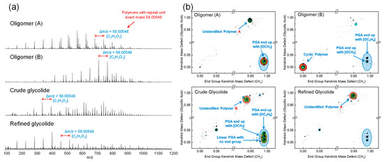 Using these two parameters and the molecular formula of the polymers, it can be known that if a series of polymers have the same end group structure, they will have both the same KMDEnd group (CH2) and KMDGA, whereas if two polymers have different carbon numbers for the end group structure, they will have the same KMDEnd group (CH2) but different KMDGA. Using such a parameter, a KMD plot (Figure 3b) can distinguish the different types of polymers, where the size of the dots and the different colors represent the relative peak intensity of the base peak. In practical calculations, m/z needs to be additionally shifted slightly towards higher values (0.0002 Da in this study) in order to eliminate the effects caused by random errors in the residual (operator mod) and rounding (operator int) functions (more calculation details are shown in Supplementary Materials). Cyclic PGA is directly composed of several glycolic acid units as it contains no end groups, and, therefore, both KMDEnd group (CH2) and KMDGA are 0, appearing in the lower left corner of the KMD plot. As for the linear PGAs, without a capping end or with a methyl or ethyl capping end, they have added [H2O], [OCH4], and [OC2H6], respectively, in their molecular formulae compared to the cyclic PGAs, which means that their KMDGA is different but the KMDEnd group (CH2) has the same value, indicating that their capping structure belongs to the homolog. In addition to the various PGAs identified above, there are several unknown PGA families that have not been identified. However, even if the molecular formulae of these polymers are not accurately identified, the use of a KMD plot can still allow the rapid classification of different types of PGA compounds without the need for molecular formulae matching calculations.