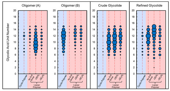 The oligomers were derived from the polymerization of methyl glycolate, with the majority of the oligomers being PGA with a lower degree of polymerization. The polymerization process begins with the transesterification reaction between methyl glycolates, which produces different oligomers. The results of both GC-MS and Orbitrap MS analyses indicate that some cyclic and linear oligomers were the main composition of the samples. These oligomers were mainly methyl-capped. Figure 4 shows the distribution of the polymerization degrees observed in the cyclic and linear polymers, as determined using the Orbitrap MS analysis of the different samples. Furthermore, the GC-MS analysis revealed a high abundance of glycolide and methyl-diglycolic esters. These methyl ester-like compounds, also known as methyl-capped oligomers, also may have originated from the esterification reaction or the small molecule alcohol residue of methyl ethanoate present in the feedstock. Furthermore, the same methyl ester compounds are also present in the subsequent process product—crude glycolide.