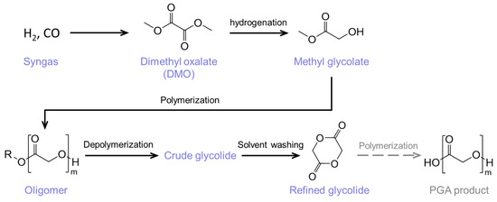 The samples were collected from the PGA unit in the CHN Energy Yulin Chemical Co., Ltd. Plant, Yulin, China, including oligomers, crude glycolide, and refined glycolide. The production of glycolide employs a coal-based syngas-derived process, as illustrated in Figure 5. Dimethyl oxalate (DMO) was firstly produced from syngas and then hydrogenated to produce methyl glycolate [23]. The methyl glycolate is polymerized to form oligomers, the intrinsic viscosity of which are controlled between 0.25% and 0.35%. The oligomers are further depolymerized and cyclized to crude glycolide, which has a low purity (about 80%). The purity of refined glycolide can be increased to 99.20% after solvent washing with isopropanol, while the acid content is less than 200 ppm. In the subsequent process, the refined glycolide will be further polymerized to produce PGA.