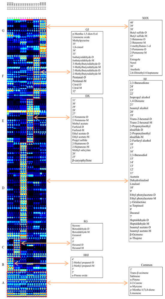 Fingerprints of six spices generated by Gallery Plot. (A) the commmon VOCs in six spices. (B): the characteristic volatile components of HHJ; (C): the characteristic volatile components of RG; (D): the characteristic volatile components of HJ; (E): the characteristic volatile components of DX; (F): the characteristic volatile components of GJ; (G): the characteristic volatile components of XHX. The unknown compounds are presented by 1′–40′, respectively.