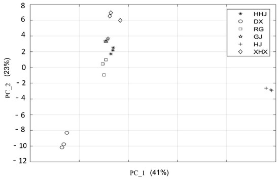The relative content of volatile organic compounds was standardized by MATLAB R2018a to obtain principal component scores and comprehensive scores (Table 3). As shown in Table 3, There were significant differences in comprehensive scores of principal components, of which HJ had the highest scores, followed by GJ, HHJ, RG, DX, and XHX.