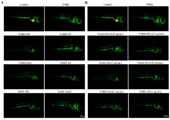 A method similar to that previously reported [38] was adopted in this work to evaluate the effects of six volatile oils on mitigating colitis. In this experiment, the healthy zebrafish Tg (zlyz: EGFP) at 72 hpf were randomly distributed into several groups and placed in twenty-four-well plates, including a blank control group, TNBS model group, and volatile oil groups (GJ group: dried ginger oils-1 ng/mL; HHJ group: black pepper oils-1 ng/mL; XHX group: fennel oils-1 ng/mL; RG group: cinnamon oils-1 ng/mL; HJ groups: zanthoxylum oils-0.25, 0.5, and 1 ng/mL; DX groups: clove oils-0.25, 0.5, and 1 ng/mL). Each group had ten fish, with three repetitions. The blank control group zebrafish were incubated in fish water without TNBS, while the others were treated with fish water containing TNBS (60 μM) under the same conditions. After 72 h, the volatile oils of six spices were added to different groups in twenty-four-well plates, incubated for 24 h, and the zebrafish were anesthetized with tricaine (0.2%, w/v) for observation and image capture. An AXIO ZOOM.V16 stereo fluorescence microscope (CarlZeiss, Jena, Germany) and DP2-BSW image software (Olympus, SZX2-ILLTQ, Tokyo, Japan) were used to analyze the captured pictures to calculate the number of neutrophils at the intestinal of zebrafish.