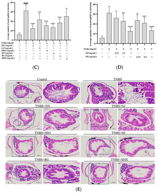 The effects on ulcerative colitis in zebrafish of volatile oils. (A) The diagram of intestinal fluorescence phenotypes in each group (n = 10, the concentration of TNBS was 60 μM and the concentration of volatile oils was 1 ng/mL, respectively). Scale bar is 500 μm. (B) The average number of neutrophils in zebrafish in each group. Significant difference was compared with the control or TNBS group, *** p < 0.001, **** p < 0.0001 vs. model group, #### p < 0.0001 vs. control group (n = 10). (C) The diagram of intestinal fluorescence phenotypes in the groups treated with DX or HJ volatile oils of different concentrations (n = 10, the concentration of TNBS was 60 μM). Scale bar is 500 μm. (D) The average number of neutrophils in zebrafish in the groups treated by DX or HJ volatile oils with different concentrations. Significant difference was compared with the control or TNBS group, * p < 0.05, ** p < 0.01, *** p < 0.001, **** p < 0.0001 vs. model group (n = 10). (E) Effect of six volatile oil samples on the histopathological structure (HE staining (green arrow)) of intestinal in ulcerative colitis zebrafish (n = 10, the concentration of TNBS was 60 μM and the concentration of volatile oils was 1 ng/mL, scale bar is 50 μm).