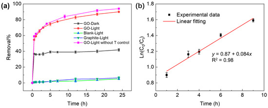 (a) TC removal by GO and graphite under dark or xenon lamp irradiation. (b) TC removal kinetic in the GO–light system. Initial conditions: [GO] = 200 mg·L−1, [TC] = 100 mg·L−1.