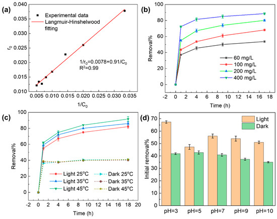(a) Correlation of the TC initial concentration (35 to 200 mg·L−1) and r0 of the initial reaction rate by the Langmuir–Hinshelwood model. (b) Effect of GO dose on TC removal performance. (c) Effect of temperature on TC removal performance. (d) Removal of TC under dark and light conditions in different acidic and basic conditions (pH = 3–10).