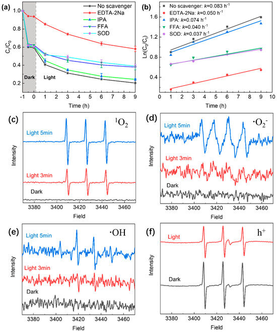 (a) Effect of various scavengers on TC removal in the GO–light system. (b) First-order kinetic plots for the scavenger-involved reactions. ESR spectra of free radicals and holes trapped by TEMP (1O2), TEMPO (h+) and DMPO (•O2− and •OH) under xenon lamp irradiation: in aqueous dispersion for trapping 1O2 (c); in methanol dispersion for trapping •O2− (d); in aqueous dispersion for trapping •OH (e); in aqueous dispersion for trapping h+ (f).