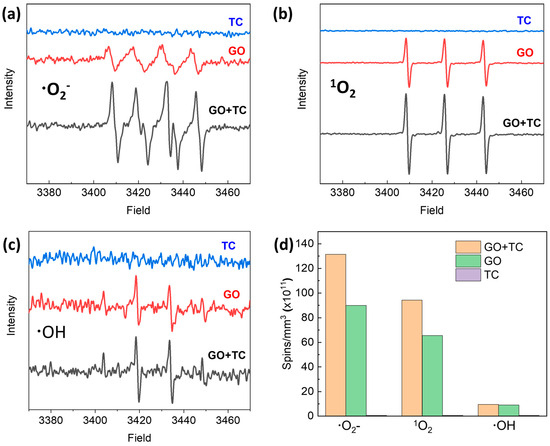 ESR spectra of radicals trapped by DMPO (•O2− and •OH), TEMP (1O2), and TEMPO (h+) in GO aqueous dispersion under xenon lamp irradiation: (a) for trapping 1O2, (b) for trapping •O2−, (c) for trapping h+, and (d) quantitative comparison of •O2−, •OH, and 1O2 produced by GO, TC, and [GO + TC], respectively.