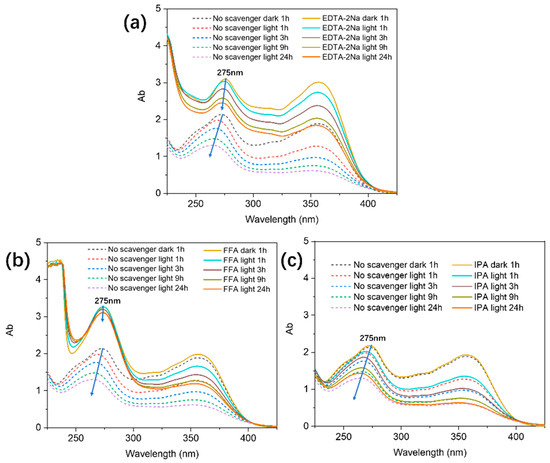 UV-Vis absorption spectra of TC solutions at different time intervals: (a) the effect of EDTA-2Na, (b) the effect of FFA, and (c) the effect of IPA.