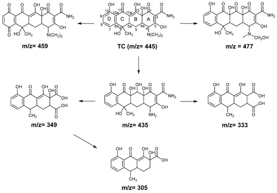 The m/z = 435 degradation products can be formed by demethylation of dimethyl amine of TC under 1O2 and •O2− attack and hydroxylation destruction under H2O2/H2O attack [28,60,61,62]. The carbon–carbon double bond on m/z = 435 can be attacked by ROS, and ring A is subsequently cracked during photocatalytic oxidation to produce intermediate m/z = 349 [63]. A similar reaction mechanism can be introduced to form the intermediate m/z = 333 [64]. The product m/z = 349 can be further decarboxylated to form another product m/z = 305 [63]. Notably, there is also a distinct peak at the retention time of 2.0 min in the LC-MS chromatogram, which could be attributed to the partial dissolution of GO in water, as the same chromatogram peak and the same mass spectra (Figure S5) appear at the retention time of 2.0 min under dark conditions. Combining our experimental outcomes and literature results, we arrive at the possible reaction pathways and the degraded products of TC degradation by the GO–light system proposed in Figure 7.