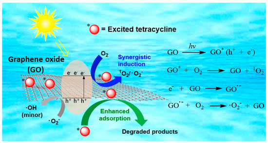 The removal of TC from water by the GO–light system has been systematically studied. Our results show that light irradiation significantly enhances the removal of TC. More than 90% of TC was removed within 20 h (100 mg·L−1 TC, 200 mg·L−1 GO) under light irradiation, which is 50% more efficient than the action of GO in dark conditions. Radical scavenging experiments, ESR, and UV-Vis spectral analysis all point to the fact that 1O2, •O2−, and h+ are responsible for the enhanced TC removal. The degradation pathway of TC is proposed based on the intermediates identified by the LC-ESIMS/MS technique. The studies provide experimental and theoretical support for the development of a new strategy for the removal of pollutants from water. At the same time, recycling or isolating GO after water treatment is still a challenge as GO is highly dispersible in water due to its abundant oxygen functional groups. This challenge is expected to be overcome by designing GO composites that can be readily isolated out of water and retain the performance of GO in terms of excellent absorptivity and photoactivity. Overall, we envision the concept of enhanced adsorption and synergistic induction of ROS generation will find extensive applications in sustainable materials and environmental technologies.
