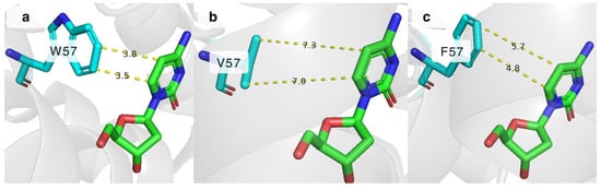 2.5. Significance of the W57 Residue in the Active Site of DmdNK