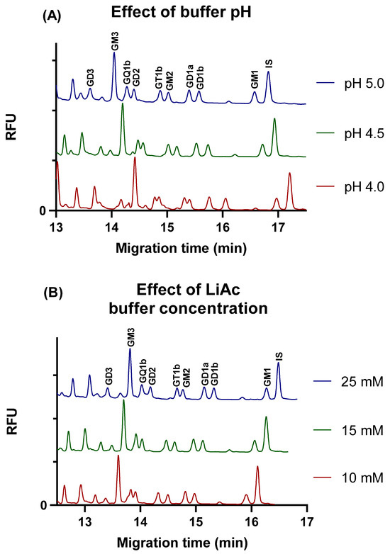 At a 10 mM LiAc concentration, the minimal resolution of the peaks of GQ1b and GD2 ganglioside glycans was observed. Increasing the LiAc concentration to a 15 mM resolution of GQ1b and GD2 gangliosides improved significantly. However, a further increase in the buffer concentration had a negative impact on the separation of GT1b and GM2 gangliosides that began to overlap at a concentration of 25 mM and above. Neither pH nor buffer concentration had a significant effect on the resolution of GD1a and GD1b isomers.