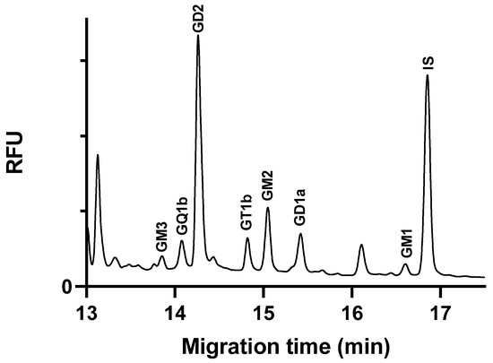 To demonstrate the applicability of the method, we analyzed, quantified, and compared the ganglioside content in two cell lines of central nervous system origin. The peak identification was performed by spiking with standards, and the amounts of gangliosides were normalized to the protein content of the samples (see in Section 3.3.2) and are given as nmol/mg protein to ensure comparability. Figure 4 shows the electropherogram of a glioblastoma cell line sample.