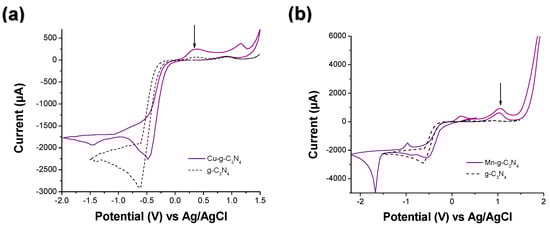 Samples were deposited on fluorine-doped tin oxide (FTO) as a transparent substrate, and cyclic voltammetry (CV) diagrams were initially created with light, Figure 1. For the CV measurements, the scanning rate was kept at 20 mV s−1. The tests were performed in three cycles between −1.5 V and +1.5 V for Cu-g-C3N4, Ni-g-C3N4, and Mn-g-C3N4, and between −2.2 V and 2.2 V for g-C3N4, as the supporting electrolyte: [Na2SO4] = 0.1 M. It was observed that the material exhibited an optical band gap, where the potential of the anodic and cathodic peak shifts with the interaction of light for these materials, demonstrating photoactivity or the presence of a photo response within the visible regions.