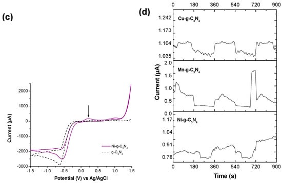 Cyclic voltammetry curves for (a) Cu-g-C3N4, Ni-g-C3N4, (b) Mn-g-C3N4, and (c) Ni-g-C3N4. Experimental conditions: sweep rate = 20 mV/s; window potential = −1.5 V and 0.0 V, supporting electrolyte: [Na2SO4] = 0.1 M; and [H2O2] = 0.01 M. (d) Chronoamperometry curves for Cu-g-C3N4, Mn-g-C3N4, and Ni-g-C3N4. Experimental conditions: V = 0.5 V; time = 15 min; supporting electrolyte: [Na2SO4] = 0.1 M; and [H2O2] = 0.01 M. The ↓ corresponds to first oxidation process.