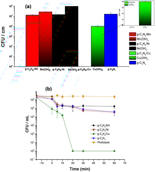 (a) Photodisinfection using hydroxides of metal ions versus materials with g-C3N4 after 20 min of exposure with a Xenon lamp. (b) Kinetic disinfection for g-C3N4 and modified materials with copper, manganese, and nickel against E. coli 25922 (Time = −15–60 min).
