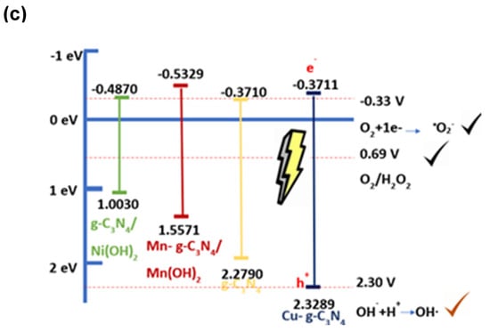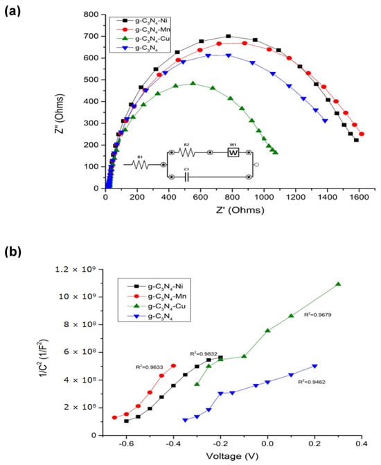Figure 3a,b is used to understand the nature and origin of ROS species with the materials that are semiconductors. Figure 3a shows that Cu- g-C3N4 has the lowest impedance resistance. This indicates the fastest electron transfer rate, enhancing the separation efficiency of photogenerated carriers. The transfer of charges across the interface between the semiconductor and the solution becomes easier, leading to an increase in the photocurrent and a better chemical catalytic performance [] as compared to the other three materials []. The curves of g-C3N4, Cu-g-C3N4, Ni-g-C3N4, and Mn-g-C3N4-Cu are depicted in Figure 3b. The electrochemical system can be described by the Randles circuit (inset in Figure 3a), where R1 is the resistance owing to the passage of electrons between the surface of the material to the reference electrode, R2 is due to the charge transfer resistance of the redox couple, W1 is denoted as the Warburg impedance that takes into account diffusion of electroactive species towards the electrode, and C1 corresponded to the non-faradaic capacitance of the g-C3N4. The flat band potentials were −0.49697, −0.53287, −0.37109, and −0.37105 eV for Ni-g-C3N4, Mn-g-C3N3, Cu-g-C3N4, and g-C3N4, respectively. It can be observed that the introduction of the transition metal as a complex into the g-C3N4 framework modified the position of the conduction band. From the thermodynamics standpoint, a more negative conduction band position suggests a major reduction potential. This is translated into a higher production of superoxide anion radical (−0.33 eV) [].