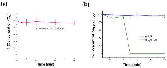 To confirm the presence of hydroxyl radicals in Cu-g-C3N4, as confirmed by electrochemical studies, scavengers like methanol (targeting hydroxyl radicals) and potassium iodide (targeting hole oxidation) were used to understand the mechanism linked to this disinfection property as compared to other materials. However, the methanol disinfection activity is well-known, complicating the interpretation of kinetic disinfection in bacterial studies. Organic molecules such as dicloxacillin are sensitive to reactive oxygen species (ROS) and, therefore, are used to examine the kinetics of degradation and to determine the evolution of ROS; the photolysis control was considered for this molecule, Figure 4a,b. Posteriorly, the scavengers (KI: holes specific; Methanol: •OH specific) were used to reveal the production of the ROS for the best material for the disinfection properties of Cu-g-C3N4.