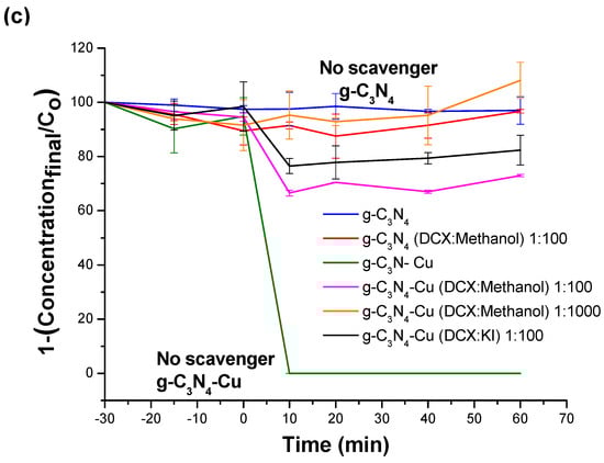 (a). Photolysis of DXC to Xenon Lamp, (b). Photodegradation using Cu-g-C3-N4 and g-C3-N4 with exposure to Xenon lamp, (c). Photodegradation using Cu-g-C3-N4 and g-C3-N4 with scavengers for •OH radical and h+ activation.