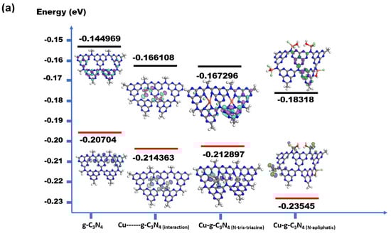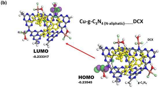 Finally, to comprehensively investigate the stability of the copper compound, theoretical calculations were carried out, as shown in Figure 5a. The HOMO with low energy corresponds with metal ions coordinated to nitrogen aliphatic, as was suggested in the spectroscopic characterization. The metal ion presence in the environment of carbon nitride decreased energy levels and compensated for the charge-negative surface. The geometry around copper is suggested to have a tetrahedral geometry, which is congruent with electronic spectra in the solid state []. Additionally, it has low stability for a structure with Cu-N-tris triazine. The interaction of the DXC with Cu-g-C3N4 coordinated the N- aliphatic can be explained as the DCX interacting with de sp2-hybridization to increase the active places for the catalyst, Figure 5b.