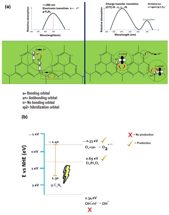 Alternatively, the coordination of g-C3N4 with transition metals as composite or doping can broaden the absorption spectrum, creating active centers within the polymer mesh that facilitate light absorption, promote efficient charge transfer, and consequently increase the generation of electron-hole pairs [,,].