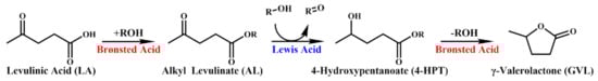 - Chia, M.; Dumesic, J.A. Liquid-Phase Catalytic Transfer Hydrogenation and Cyclization of Levulinic acid and Its Esters to γ-Valerolactone over Metal Oxide Catalysts. Chem. Commun. 2011, 47, 12233–12235. [Google Scholar] [CrossRef] [PubMed]