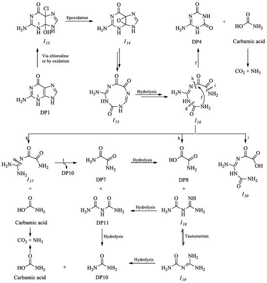 The DP1 is a key product that, in the protonated form at the nitrogen N-3 on the pyridine ring, could undergo an oxidation reaction at the double bond between carbons C-4 and C-5, resulting in the formation of intermediate I13 (Figure 3). This intermediate, through intramolecular epoxidation, could give rise to intermediate I14, that, through subsequent oxidation and intramolecular hydrolysis, could give rise to intermediate I15. Upon hydrolysis of the imine function of this last one, intermediate I16 could be obtained, and the following pathway f, could undergo an intramolecular attack by one of its two amine functions on one carbonyl function, forming DP4 and carbamic acid. The latter would subsequently degrade to carbon dioxide and ammonia. Hydrolysis of one of the two terminal amide bonds, as indicated by the pathway g, could lead to intermediate I17 and carbamic acid. From I17, hydrolysis of the imine bond, as indicated by the pathway l, could yield products DP7 and DP10.