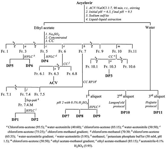 A solution of ACV at a concentration of 10−5 M was treated with a 10% hypochlorite solution (hypochlorite–ACV: molar ratio of 1:1) for 20 min at room temperature. The solution initially had a pH close to neutral, which, after the addition of hypochlorite, reached approximately 8.0. The presence of ACV was determined spectrophotometrically with absorbance peaks measured at 252 nm [45] using a previously prepared calibration curve. Under these conditions, the byproducts DP1–DP11 formed were too low in abundance to isolate.