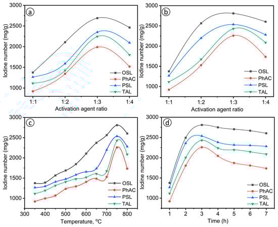 Figure 2d shows the effect of activation time, with iodine numbers peaking at around 3 h and then declining. Prolonged activation times may lead to similar issues as excessive activation agent ratios and temperatures, such as pore collapse or blockage. OSL shows significantly higher iodine numbers up to 2800 mg/g than the other precursors, indicating superior performance and more effective activation within the optimal 3 h timeframe. PSL also demonstrates substantial increases in iodine number more than 2540 mg/g, but to a lesser extent than OSL. In contrast, PhAC and TAL exhibit less pronounced increases and earlier declines in iodine number around 2430 and 2250 mg/g, respectively, indicating lower tolerance to extended activation times. OSL, with its higher specific surface area and developed porosity (Table 2 and Figure 1), performs exceptionally well under optimal activation times, while PhAC and TAL, with lower specific surface areas, are more susceptible to structural damage from prolonged activation.