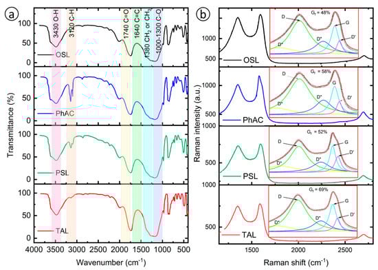 The Raman spectra analysis depicted in Figure 3b for the AC samples—OSL, PhAC, PSL and TAL—reveals critical insights into their structural properties and degrees of graphitization. Using Lorentzian curve deconvolution, the analysis isolates key Raman modes D*, D, D″, G and D′ bands, allowing for precise differentiation between graphitic and disordered components. This method surpasses the traditional I(D)/I(G) ratio by overcoming inaccuracies from band overlap, providing clearer insights into each sample’s structural features. The degree of graphitization (Gf) was quantified using the equation [57,58]: