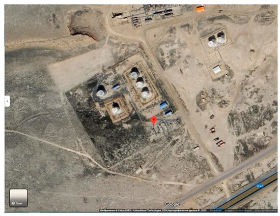 To confirm the results in real conditions, field tests were conducted at the Zhanatalap oil field in the Atyrau region (Figure 4). Two sites were designated: a control site and a site treated with AC obtained from rice husk, reed stalks, pine sawdust and wheat straw. AC was introduced into the oil-contaminated soil, and samples were collected periodically from 8 to 16 days after treatment to estimate the oil content using the gravimetric method. Figure 5a shows the initial and subsequent oil content in the soil samples.