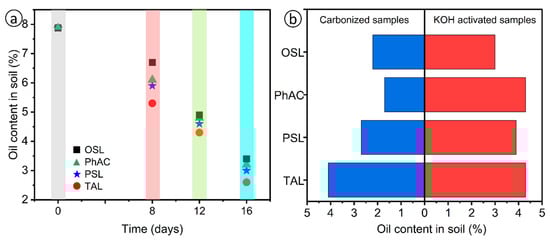 Figure 5a shows the values of the oil content in contaminated soils. The initial degree of soil contamination with petroleum hydrocarbons was 79.2 g/kg or 7.9 wt.%. After applying AC samples to oil-contaminated soil, the oil content gradually decreases. On the soil samples with the addition of AC on the 8th day, the oil content was 5.7–6.7%, on the 16th day—2.6–3.3%. According to the oil content in soil samples, the degree of soil purification was calculated, the value of which after 16 days was 58.2–67.1% in soils with sorbent (Table 4). The conducted tests have demonstrated that the AC samples exhibit a high efficacy in soil purification. Specifically, after 16 days, the degree of purification of oil-contaminated soil reached 67.71%.