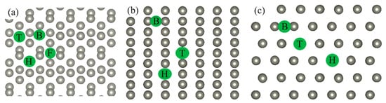 High-symmetry adsorption sites. FCC (F), hcp (H), bridge (B), and top (T) on the (a) Zn(111), (b) Zn(110), and (c) Zn(100) surfaces. Zn atoms and high-symmetry adsorption sites are indicated by gray balls and green balls, respectively.